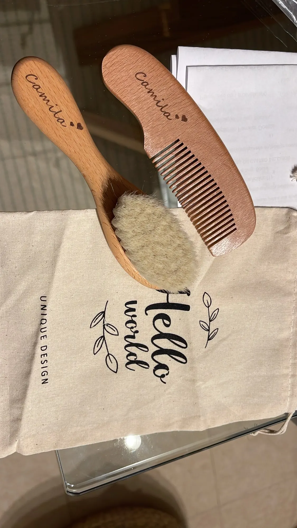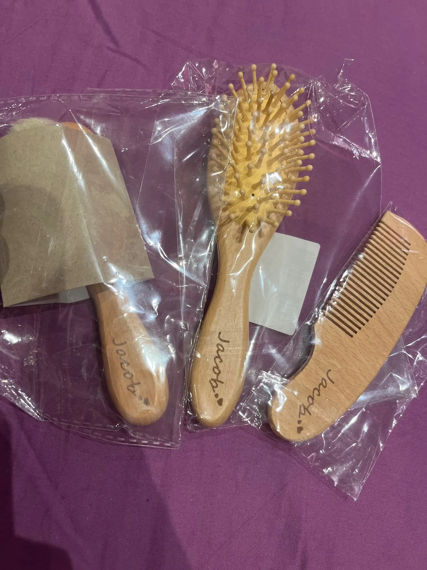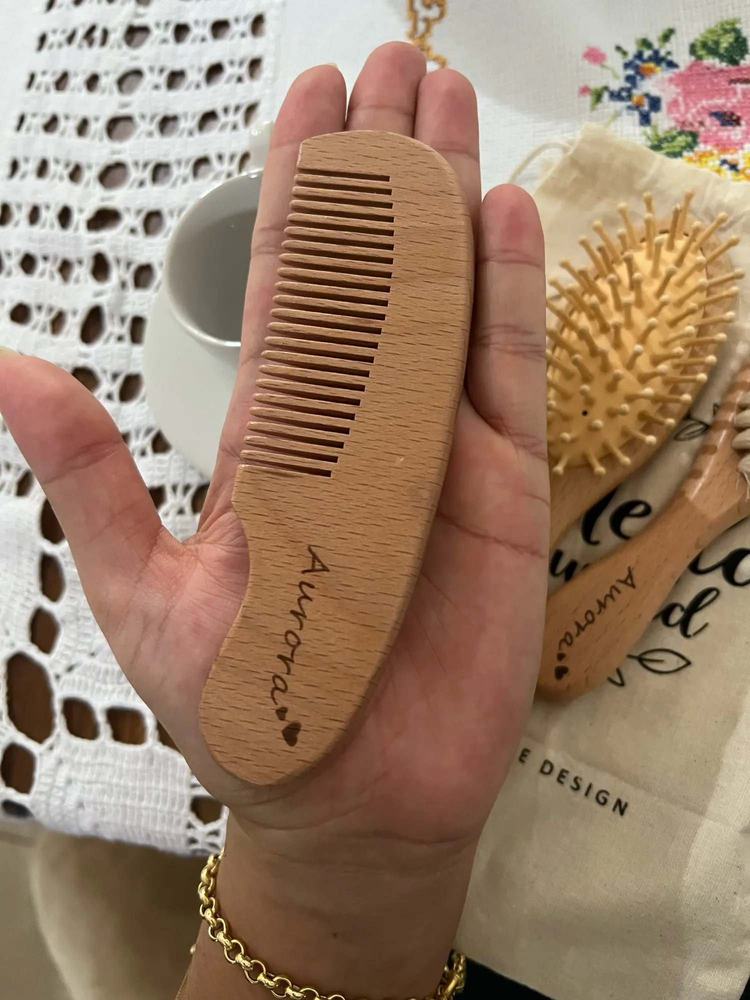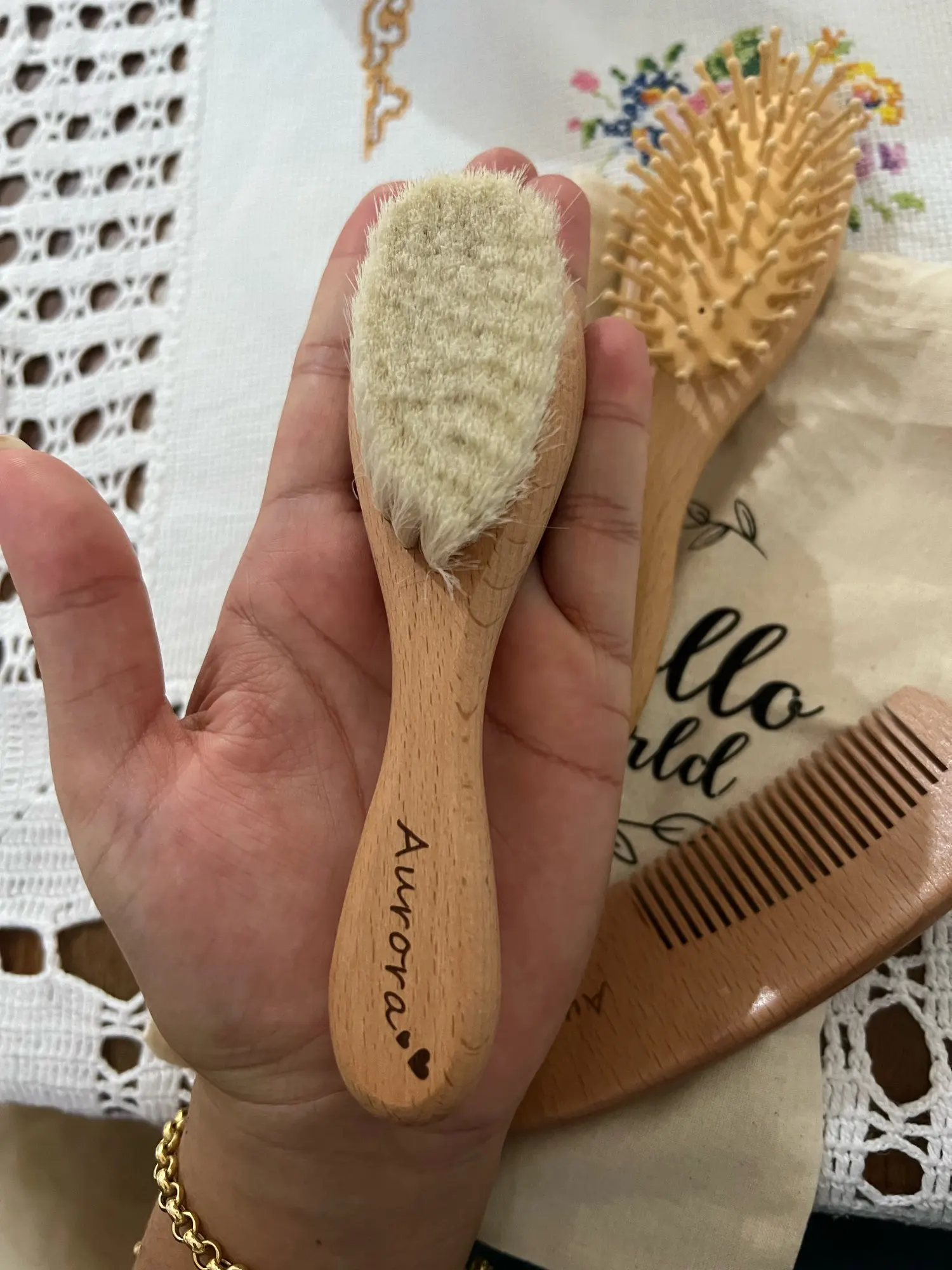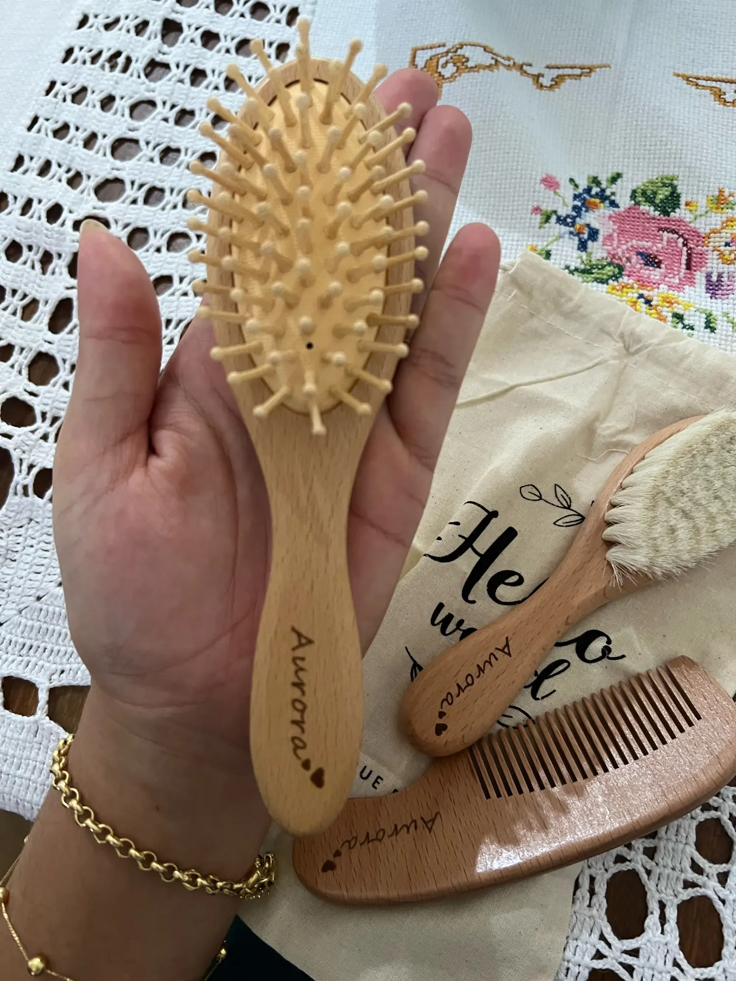 Questo kit personalizzabile può includere una spazzola da massaggio, una spazzola con setole morbide e un pettine, tutto in legno naturale sostenibile. La borsetta inclusa rende facile portarlo sempre con te per tenere i capelli e il cuoio capelluto del tuo bambino sani e felici.
